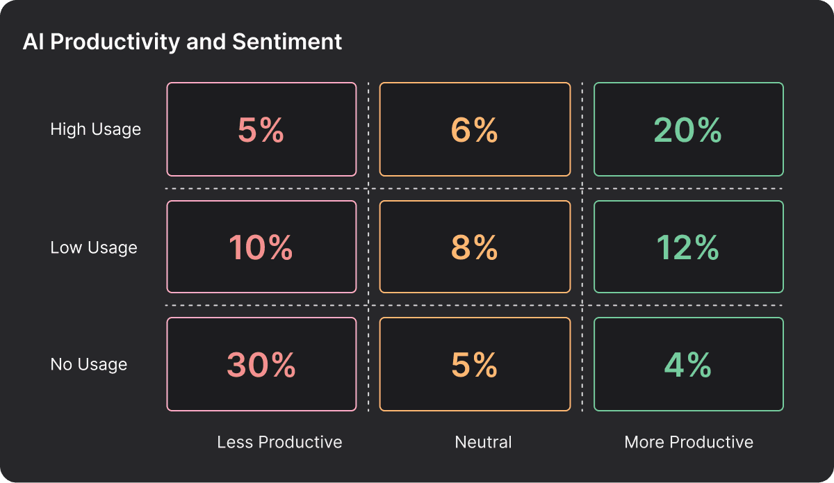 Map the intersection between usage and productivity (as reported by users) to identify which teams are leaning into AI successfully and which teams are struggling to target enablement and manage licensing investments.