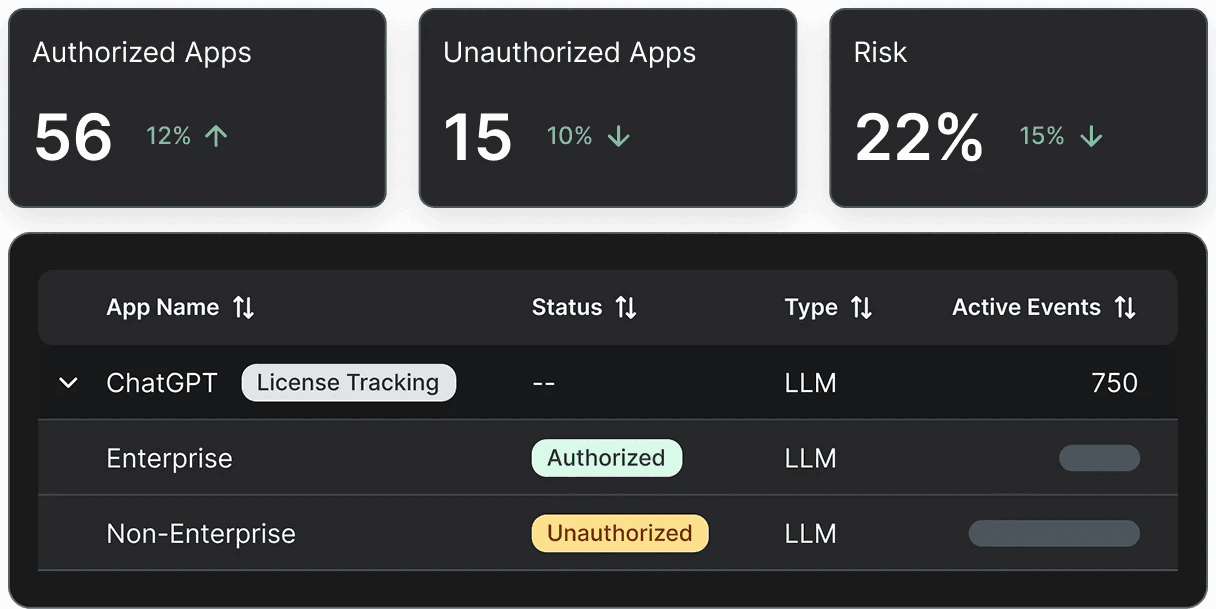 Deploy Scout across the enterprise and you will quickly have a categorized inventory of every AI LLM and application detected. Drill down to set policies or explore usage by team or location.