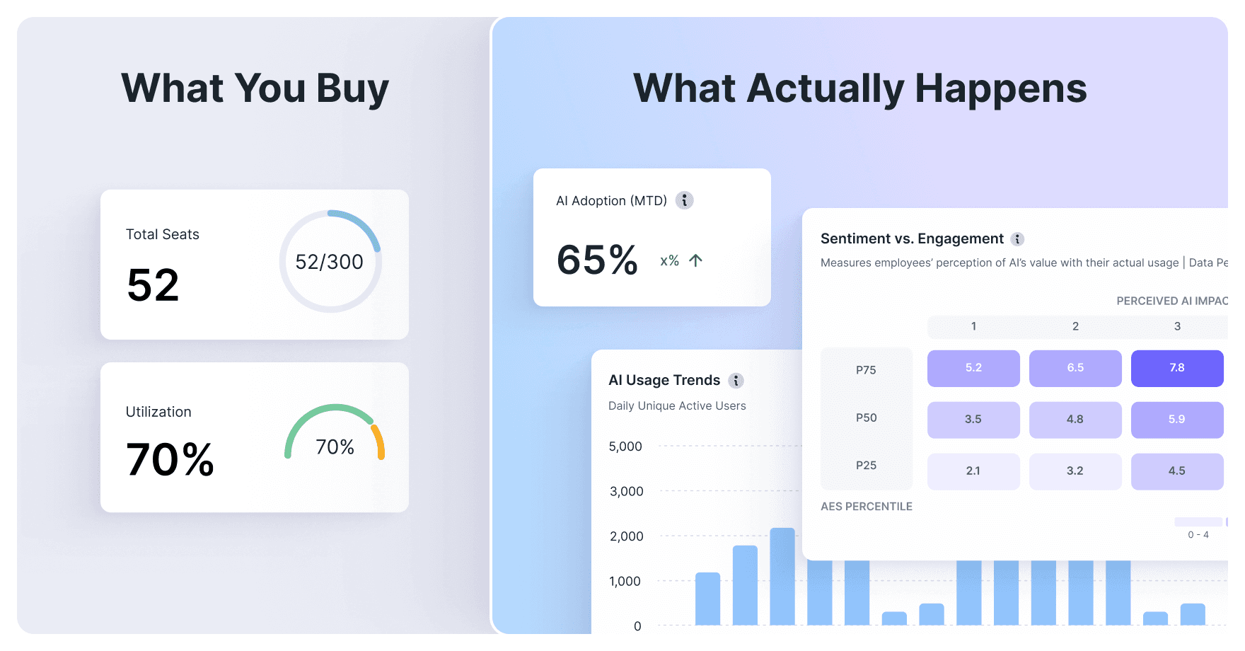 You measure AI ROI by connecting three data points—utilization, proficiency, and value—to identify where AI investments are actually driving business impact.