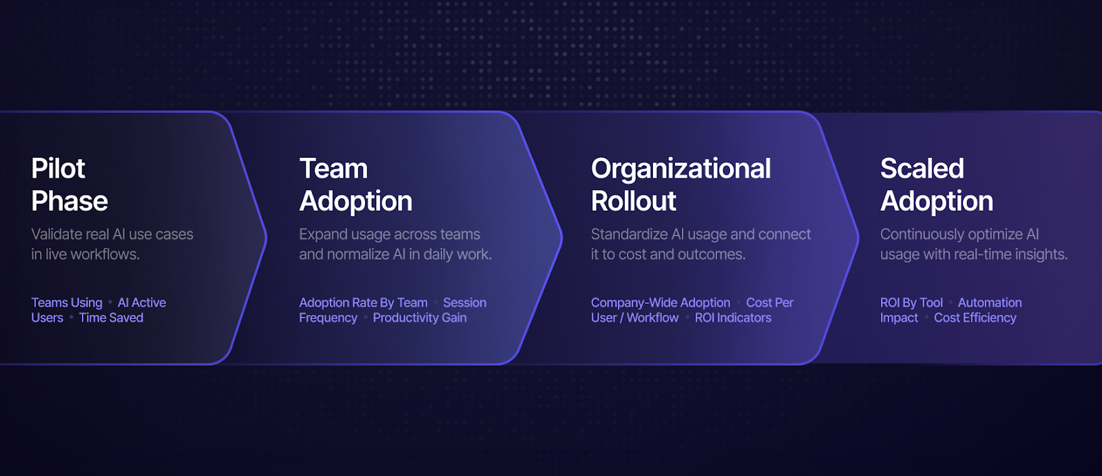 Monitor key indicators, such as the percentage of processes with AI integration, the number of scaled use cases beyond pilots, adoption rates, the rate of data governance compliance across your organization, and training completion. Benchmark against industry standards where available.