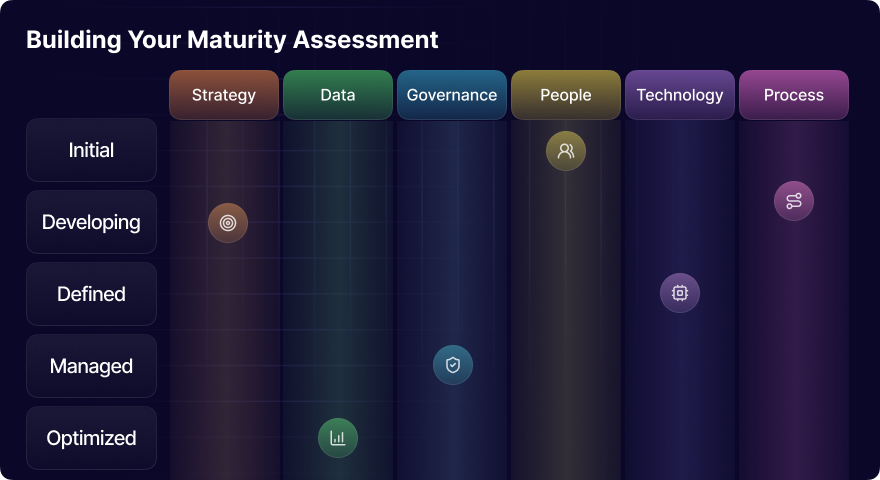 Compare your activities against maturity model indicators. Identify which stage you occupy across different dimensions. Some areas might be stage 3, while others remain in stage 1. Uneven progress is normal as organizations optimize different capability areas at different speeds.