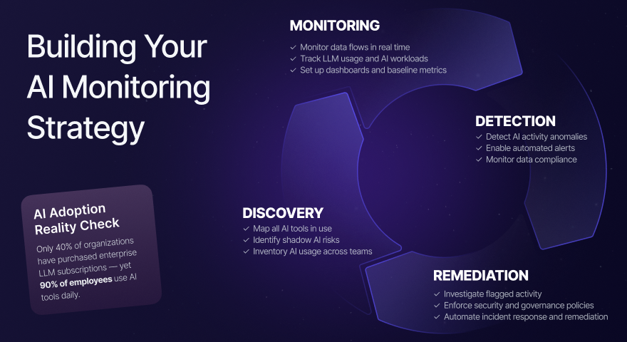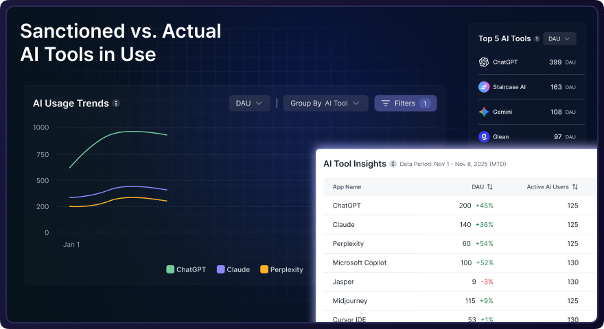 - AI Monitoring: Continuous tracking and analysis of AI tool usage across an enterprise to identify both sanctioned and unauthorized applications, measure adoption patterns, and detect security risks in real-time.