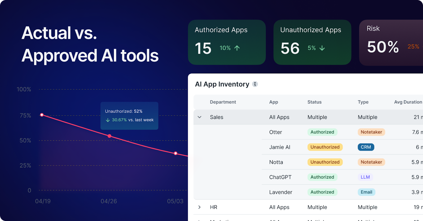 - Real-Time Governance: Dynamic AI policy enforcement that scales with adoption velocity, providing security oversight without blocking productivity or innovation.