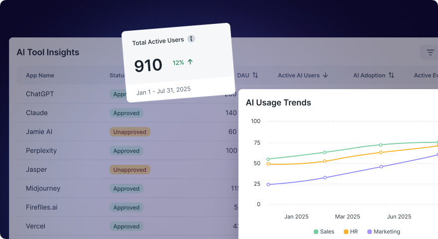 Usage trends show where to optimize licensing allocation. Automated tracking reveals if departments are over-licensed and have unused seats or teams are under-licensed, so employees have to share accounts, use personal accounts or use unmonitored “shadow” AI. Data-driven decisions about pricing tiers ensure you buy the right licenses at the right levels.