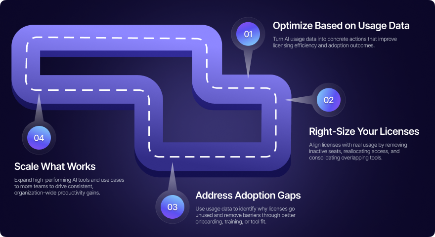 Turn tracking insights into action through systematic optimization of licensing allocation and AI adoption strategy.