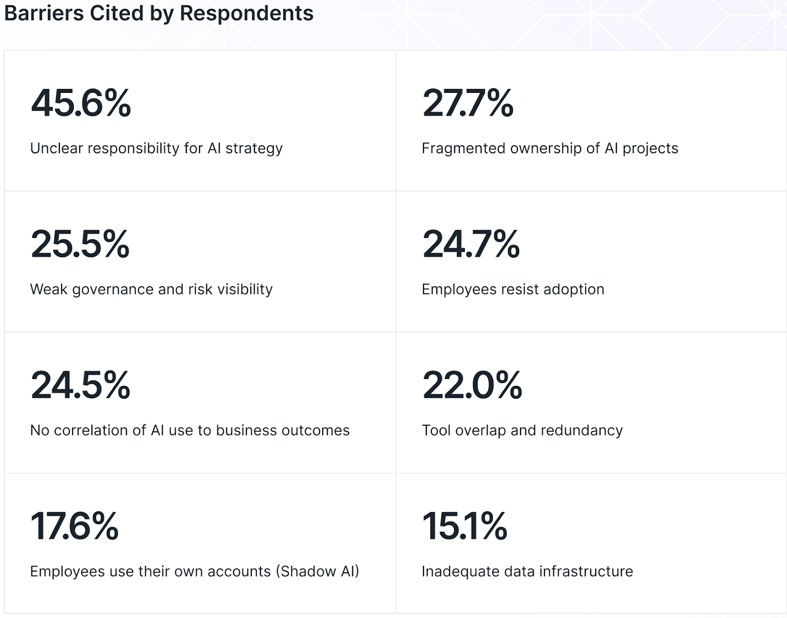Figure 1 shows barriers to effective AI adoption in the workplace, from the Larridin State of Enterprise AI 2026 report. Governance helps to eliminate or reduce most such barriers.